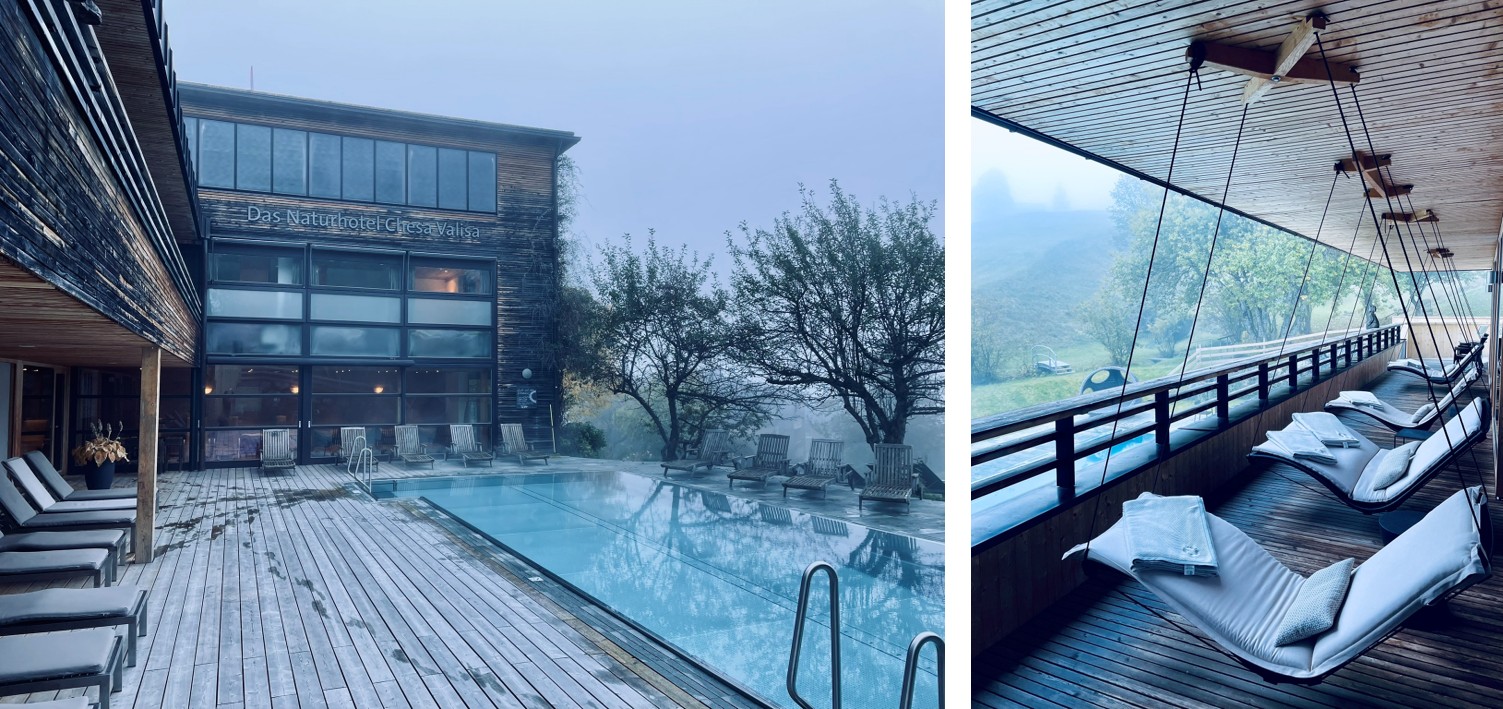 Am Nächsten Morgen gönne ich mir eine bewusste Auszeit. Als der Nebel noch im Tal liegt ziehe ich ein paar Bahnen im beheizten Naturpool, der mit Quellwasser gefüllt ist. Dieser ist Teil des AlpinSPAS, das außerdem mit Bio- und finnischer Sauna, Dampfbad und Infrarot-Wärmekabinen lockt.