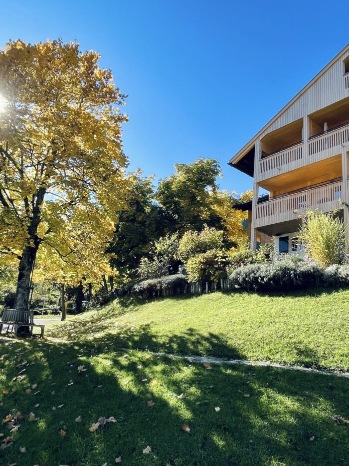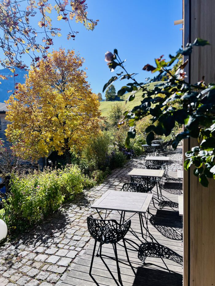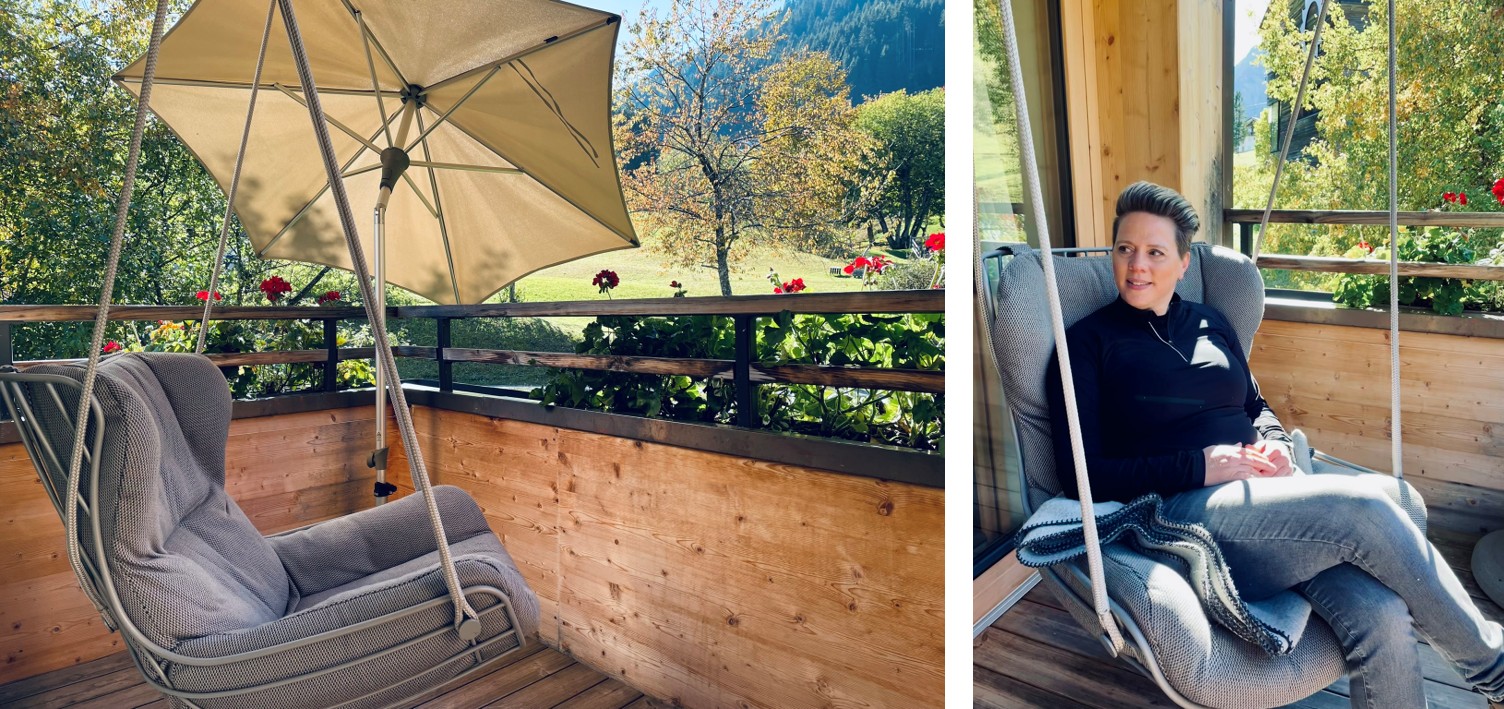 Zurück im Hotel lassen wir uns von der Nachmittagssonne auf unserem Balkon verwöhnen. Dieser wird nach einem aktiven Tag zum Lieblingsplatz, um die Seele baumeln zu lassen. Das Rauschen des Naturbachs und der Blick in den idyllischen Garten lassen uns schnell die Zeit vergessen.
