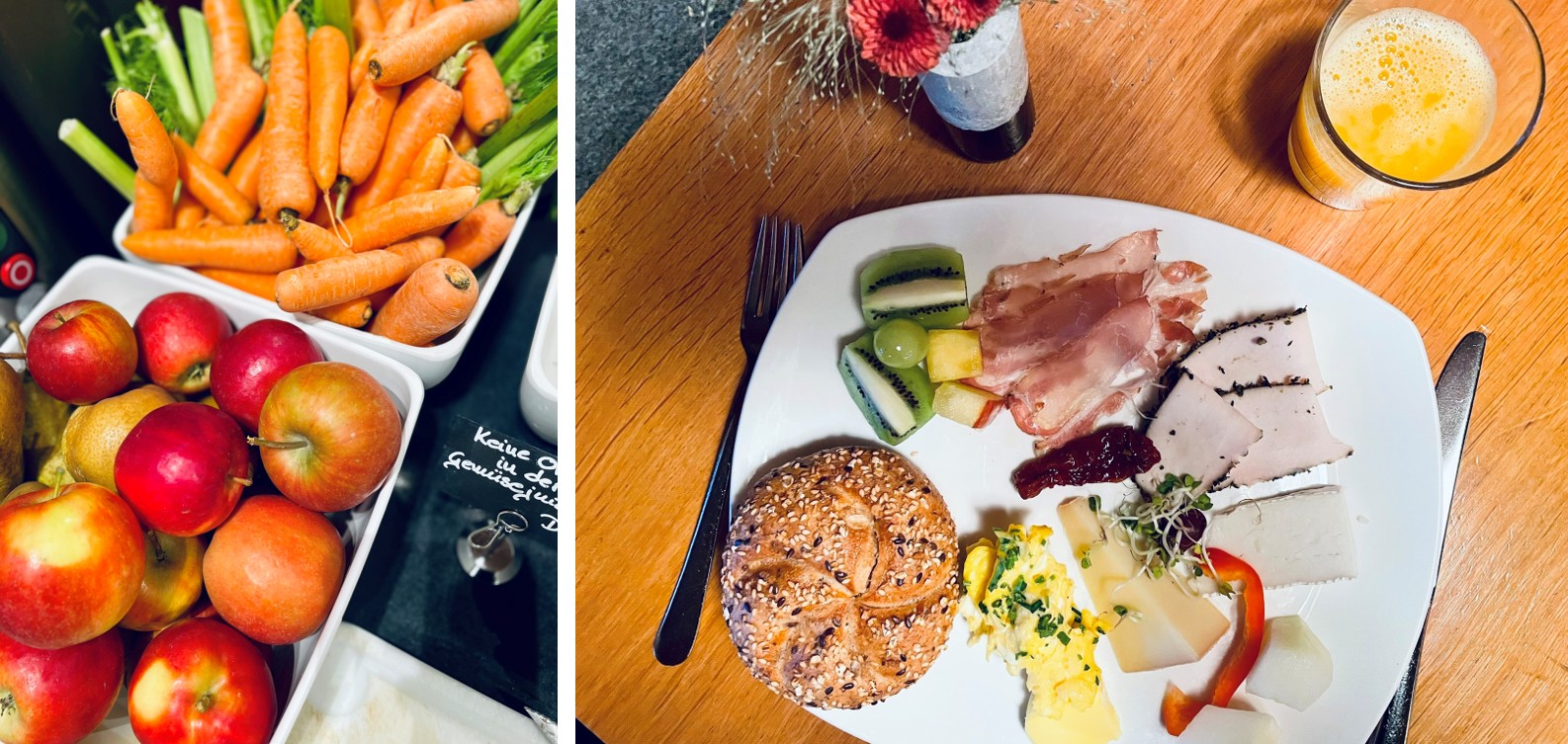 Nun ruft das Frühstück. Hier kommt viel Gesundes auf den Tisch. Orangen werden selbst gepresst und Gemüse zu einem leckeren Smoothie verarbeitet. Dazu Joghurts, Müsli und auch hier wieder Optionen aus der ayurvedischen Küche. Natürlich eine Käse- und Wurstauswahl und täglich wechselnde Eiergerichte. Dazu hausgemachte Marmeladen, Honig und eine Brot- und Brötchenauswahl. Wer mag, kann sich hier auch gerne eine Jause für unterwegs mitnehmen und die Brotzeit später am Berg genießen.