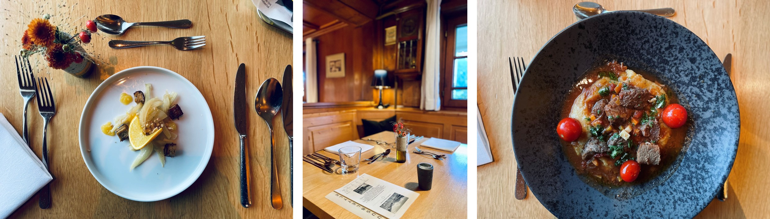 Am Abend nehmen wir dann im Restaurant Walsereck Platz. Jede der Stuben ist einzigartig. Für uns ist der Wintergarten reserviert, der mit einem aussichtsreichen Blick auf die umliegenden Berge trumpft. Dort wartet ein Genussmenü auf uns, mit regionalen und saisonalen Gerichten, die mal modern interpretiert sind, mal klassisch oder mit ayurvedischen Einflüssen. Für alle die es gern vegetarisch oder vegan mögen, gibt es vielfältige Varianten. Ein weiteres Highlight, das Käsebrett mit einer großen Auswahl an Käsespezialitäten aus der Region.