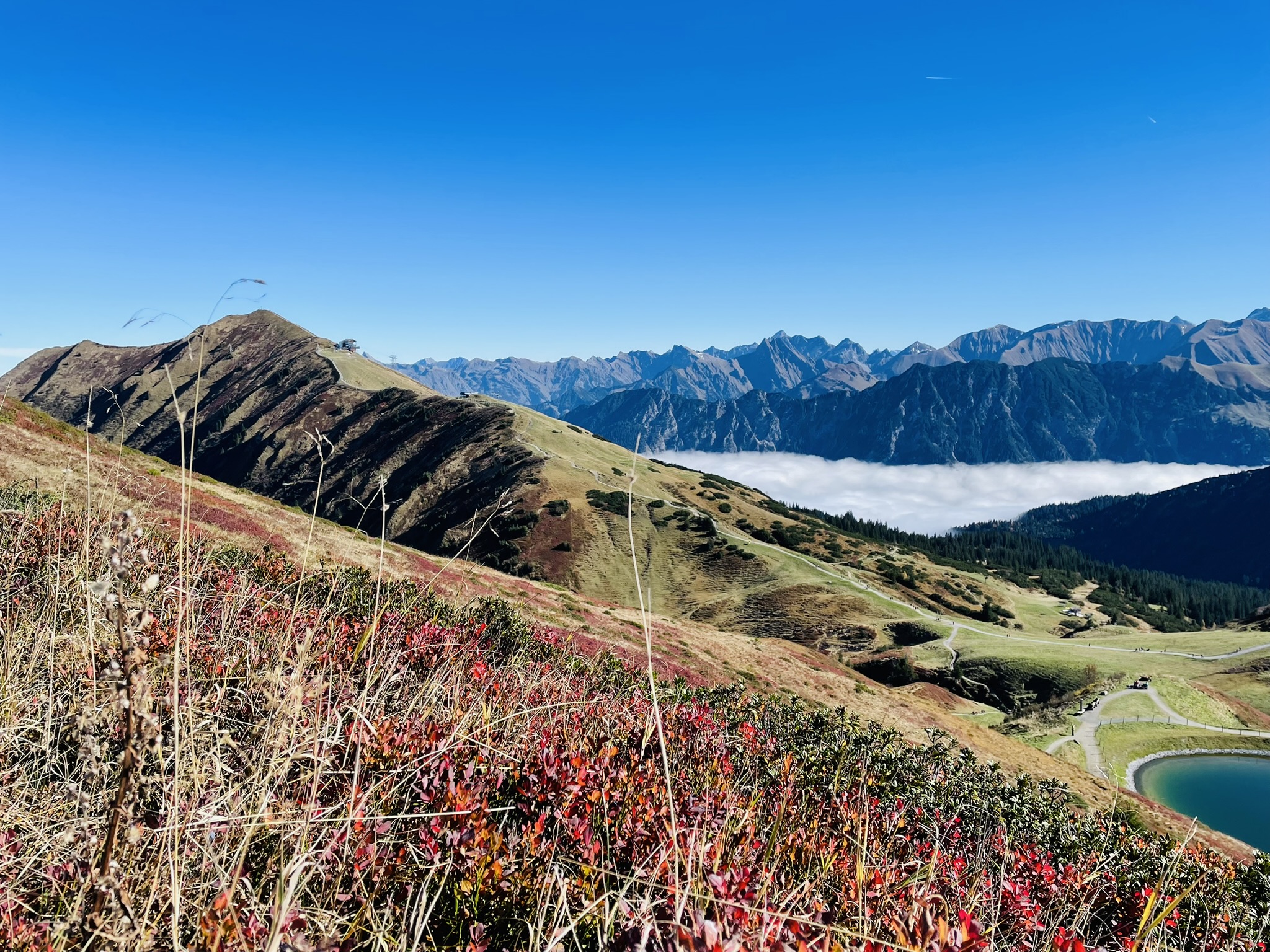 Die Landschaft der Vorarlberger Alpen ist ein faszinierendes Wechselspiel aus schroffen Gipfeln, sanften Almen, tiefen Schluchten und glasklaren Bergseen – eine alpine Bühne voller Kontraste – heute mit einem ganz besonderen Schauspiel. Ein Nebelmeer aus watteweichen Wolken breitet sich vor uns aus, die Sonne kitzelt sanft im Gesicht und wir genießen die atemberaubende Aussicht in die umliegenden Berge. So schön, dass wir gerne noch etwas länger bleiben, bevor es wieder zurück ins Tal geht.