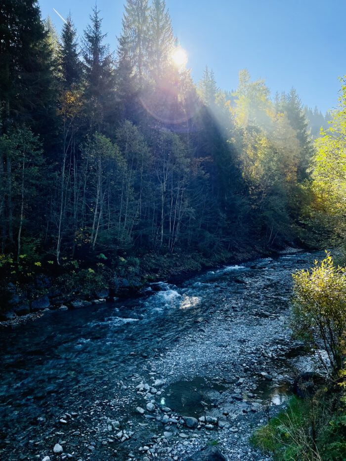 Nach einer kurzen Einführung spazieren wir gemütlich zum Gebirgsfluss Breitach. Dort tauchen wir ein in die Waldatmosphäre, hören das rauschende Wasser, bestaunen das bunte Blätterdach der Bäume und entfliehen für einen Moment dem Alltag.