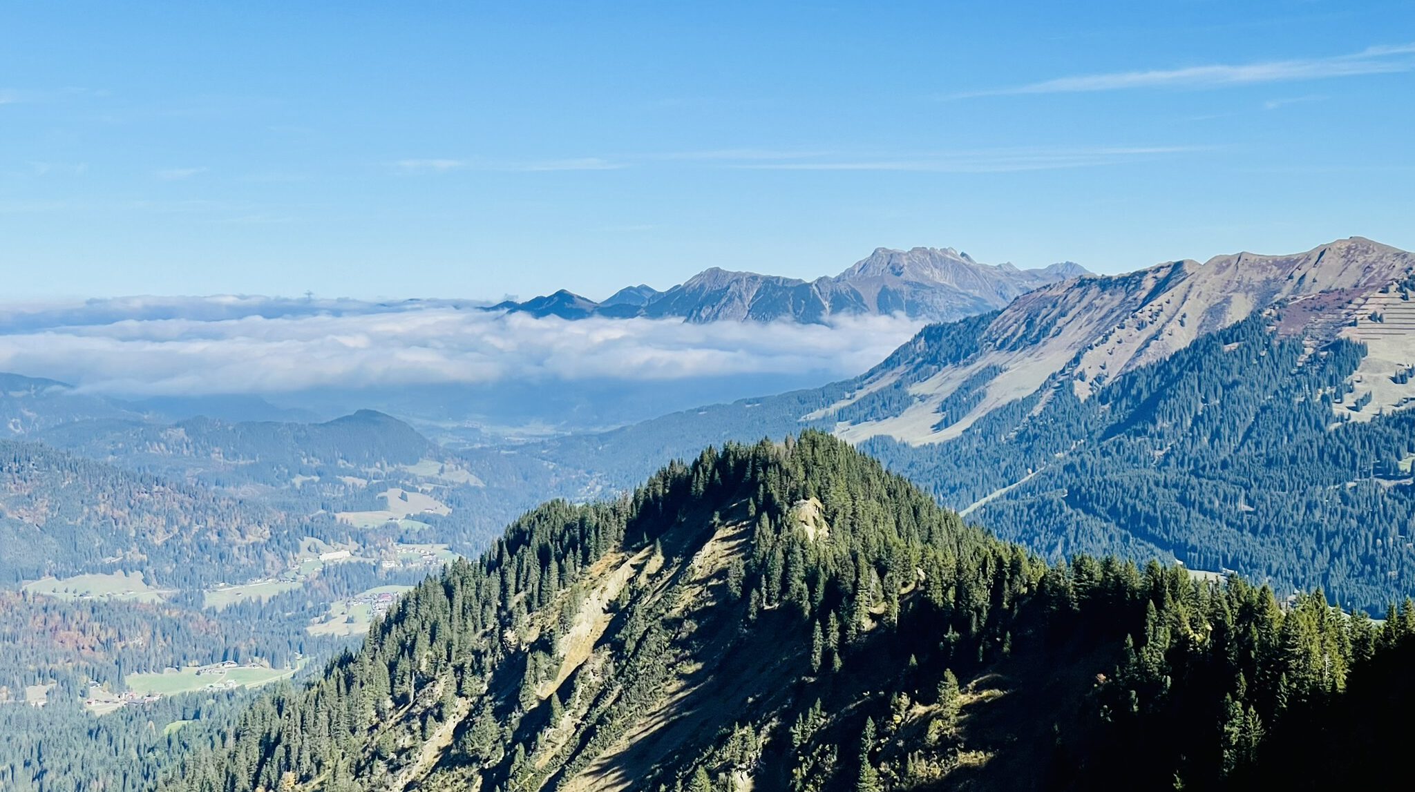 Mit dem Walserbus geht es für uns bequem nach Mittelberg, wo uns die Walmendingerhornbahn auf fast 2.000 Meter Höhe bringt. Oben angekommen, eröffnet sich ein beeindruckendes 360° Panorama. Wir blicken auf die Gipfel der Allgäuer Alpen, die sanften Höhenzüge des Bregenzerwaldes – das Kleinwalsertal zu unseren Füßen. Ein gelungener Abschluss für unsere kleine Auszeit.